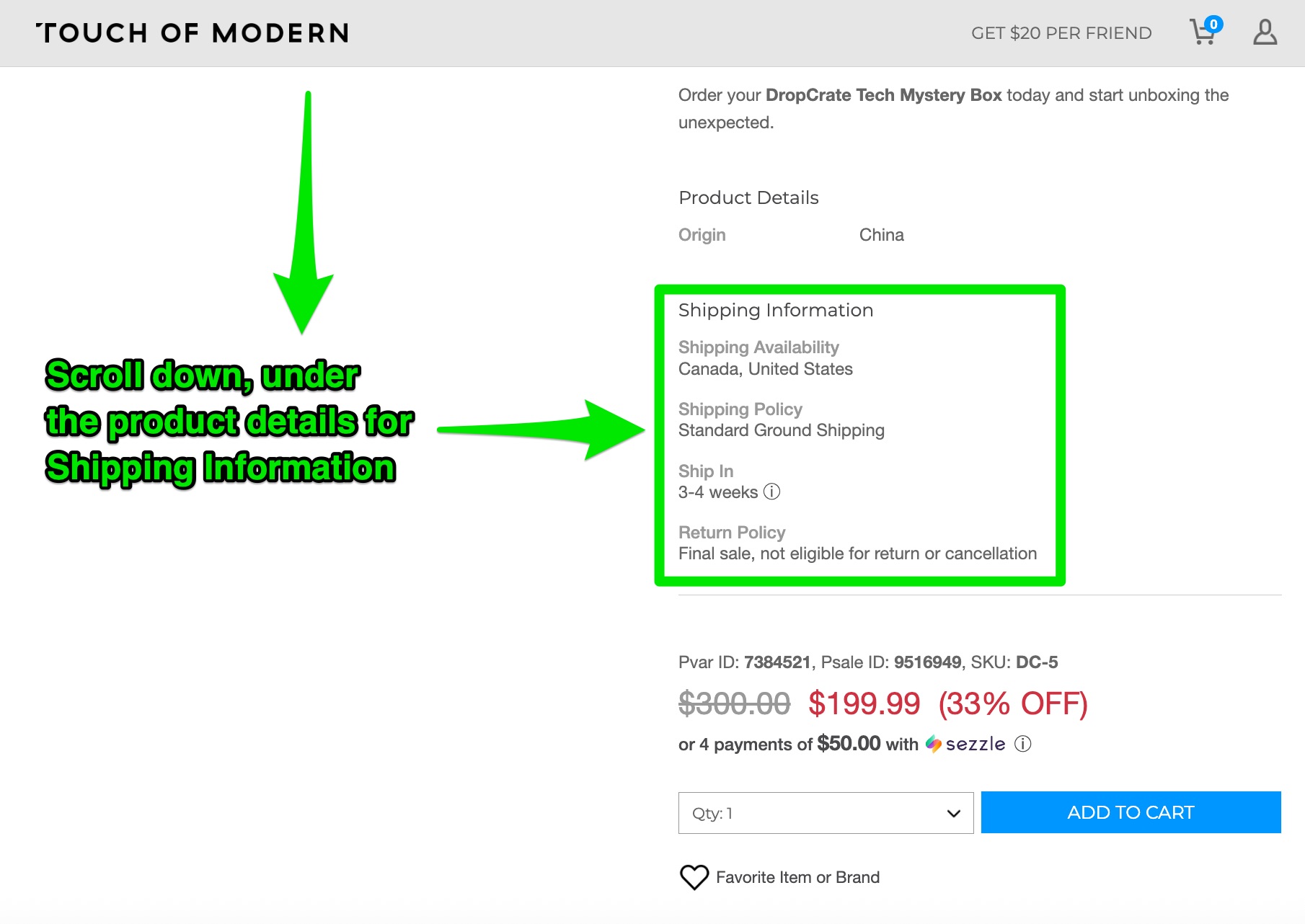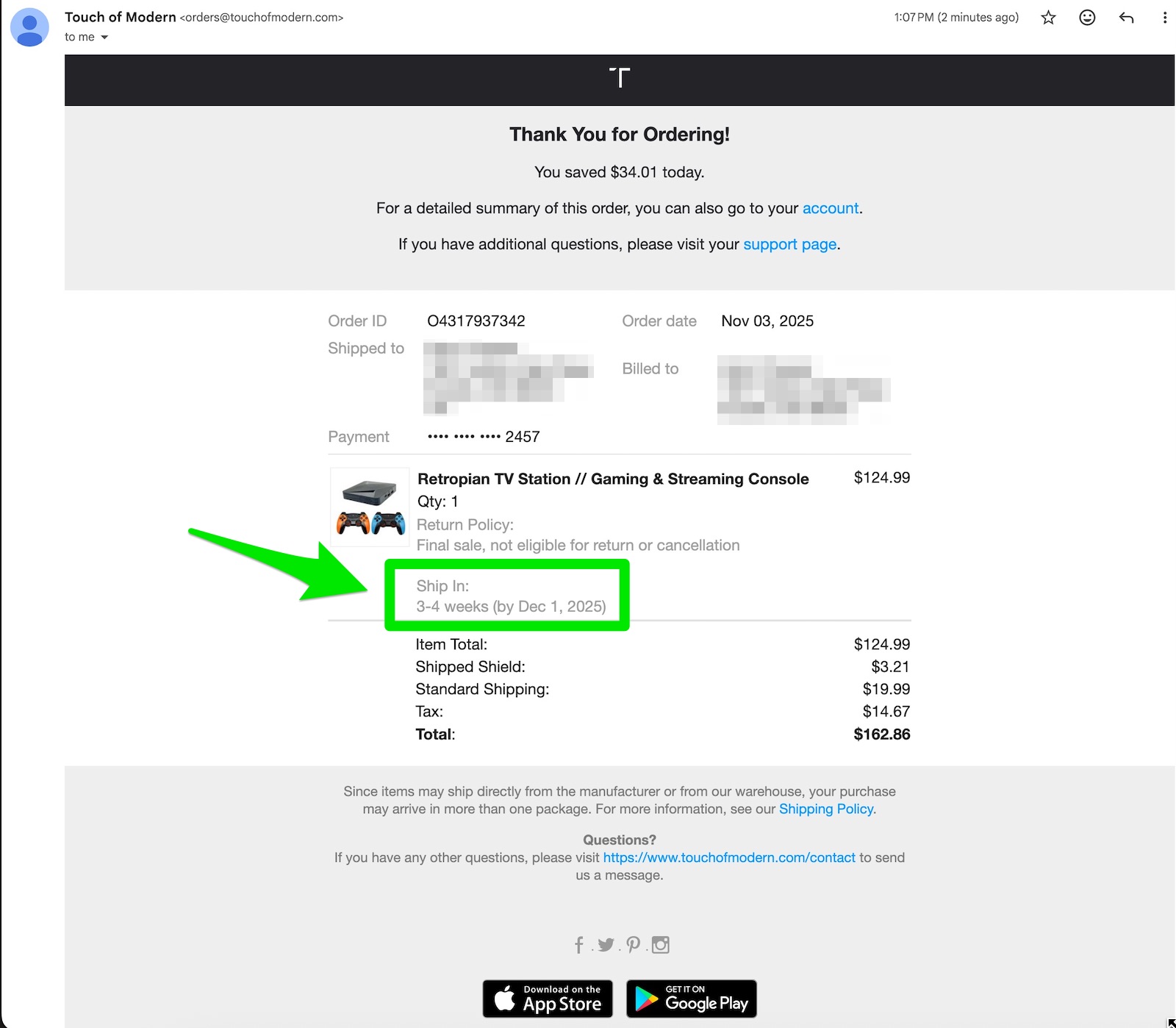 On the product page, throughout checkout, in your confirmation email, and next to the item(s) in your Order History, you’ll see the estimated ship window specific to each product. We work closely with our suppliers to meet these timeframes: