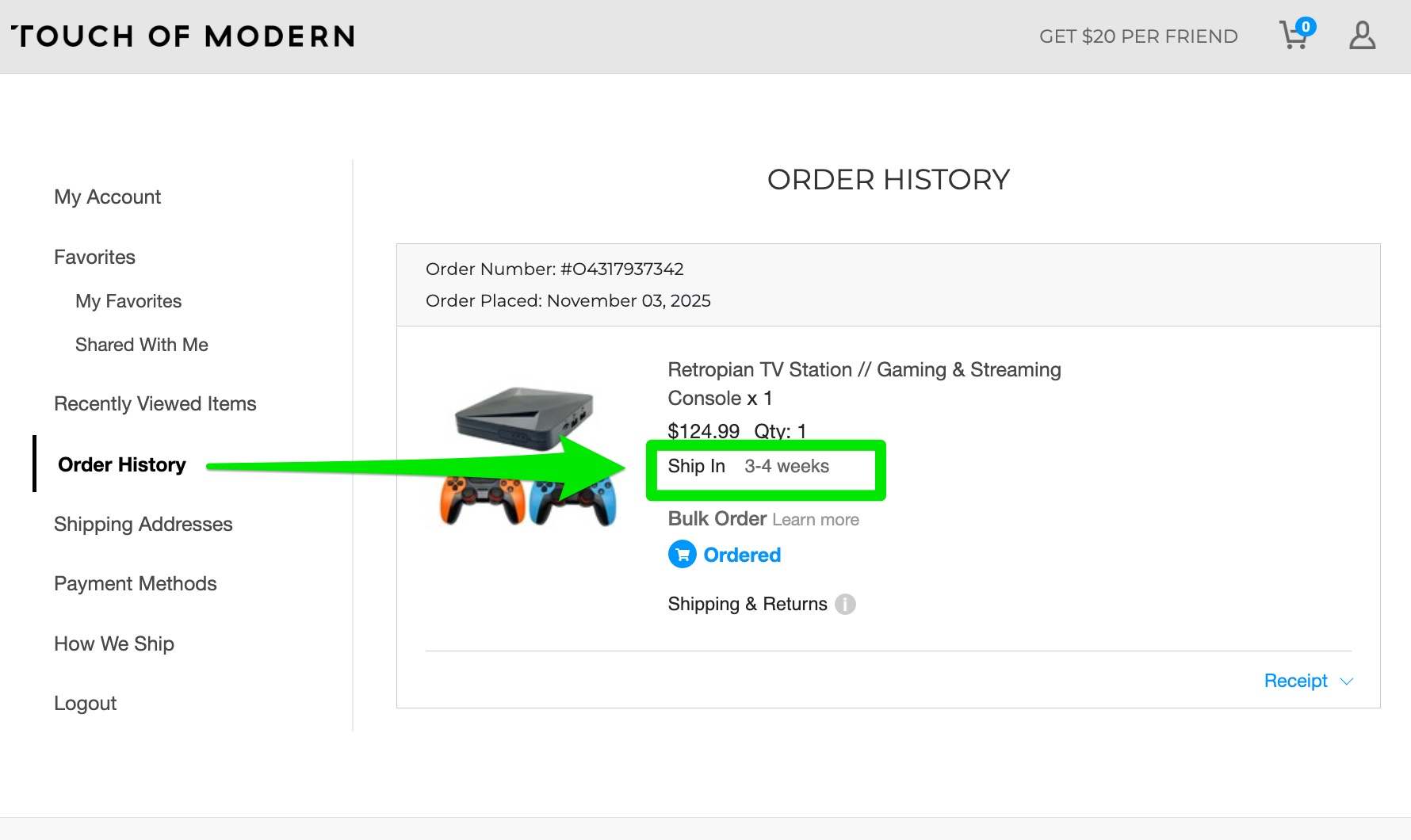 Once shipped, you’ll receive an email with tracking information. Delivery times vary based on whether your item ships from a supplier or from our warehouse. You can also track the status of your order in the Order History section of your Account page.